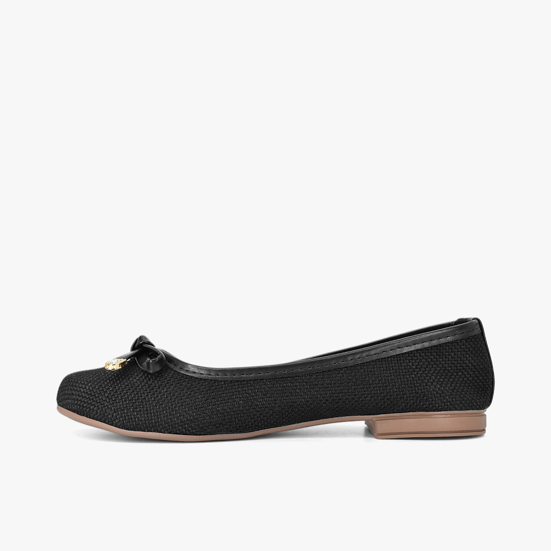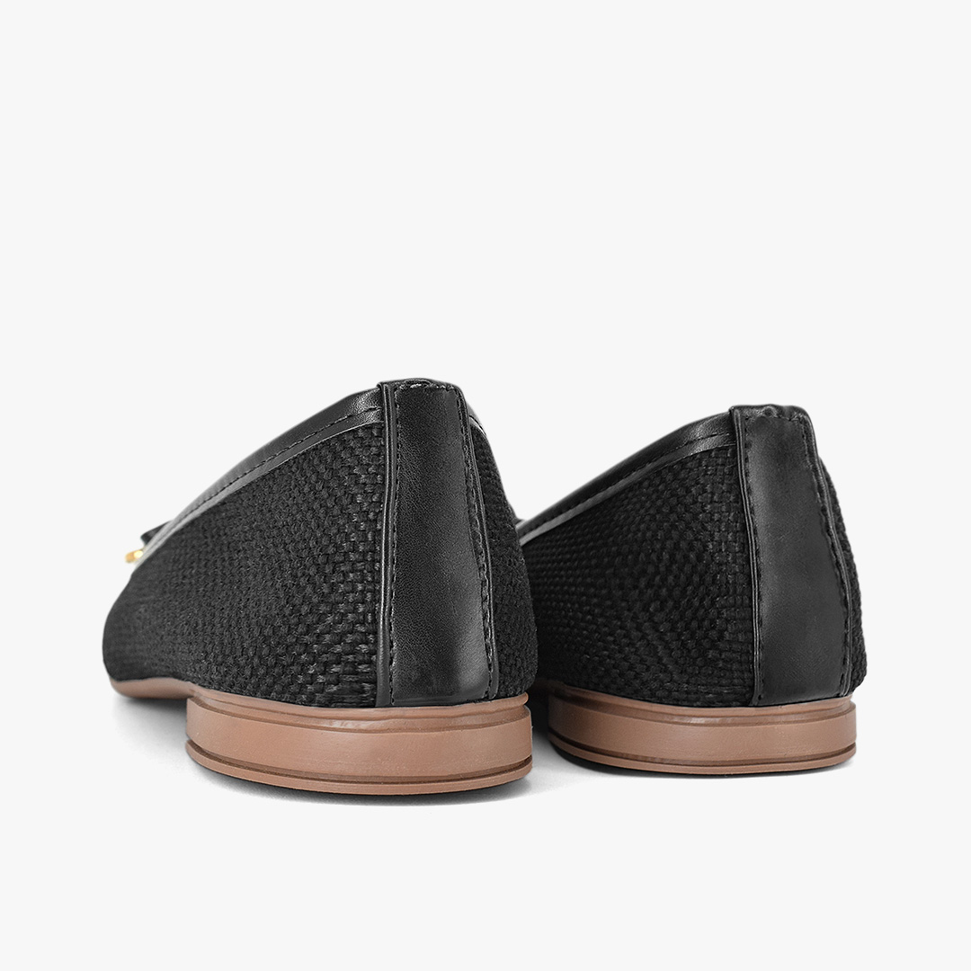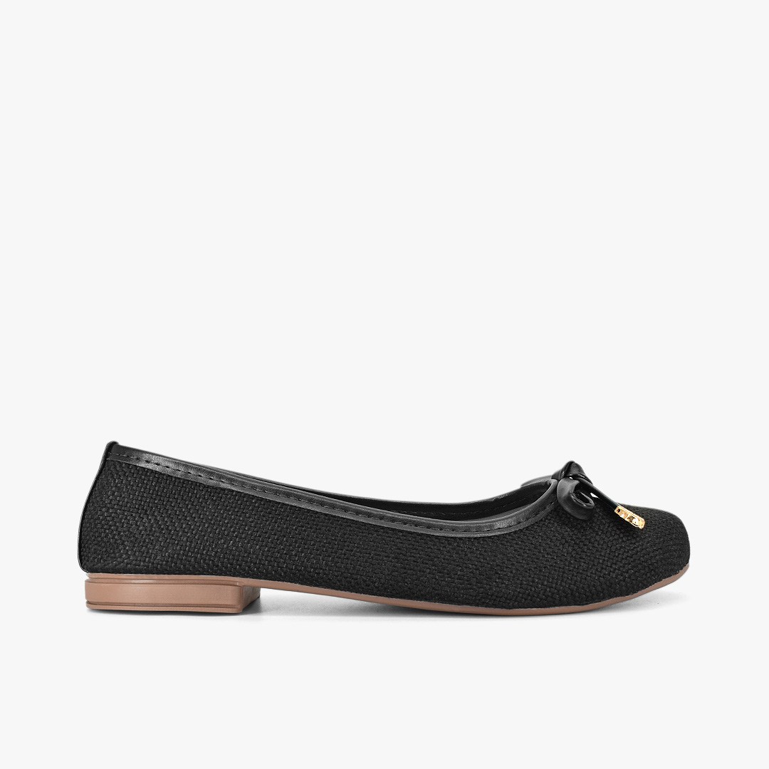 Un básico infaltable en tono negro con textura sutil que eleva cualquier look. El delicado lazo decorativo con puntas metalizadas aporta un detalle femenino y sofisticado, perfecto para combinar con outfits formales o casuales. Versatilidad y estilo en un solo par que querrás llevar todos los días.