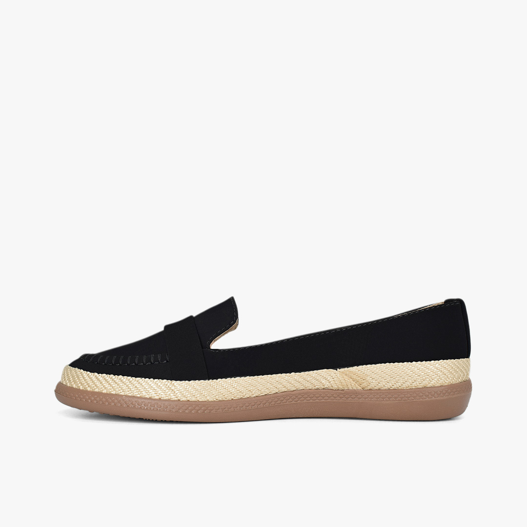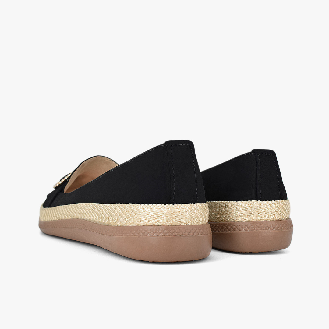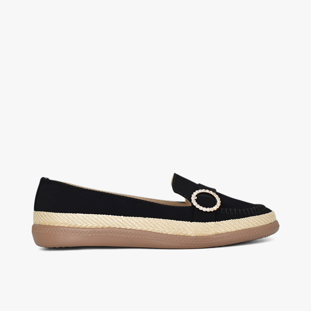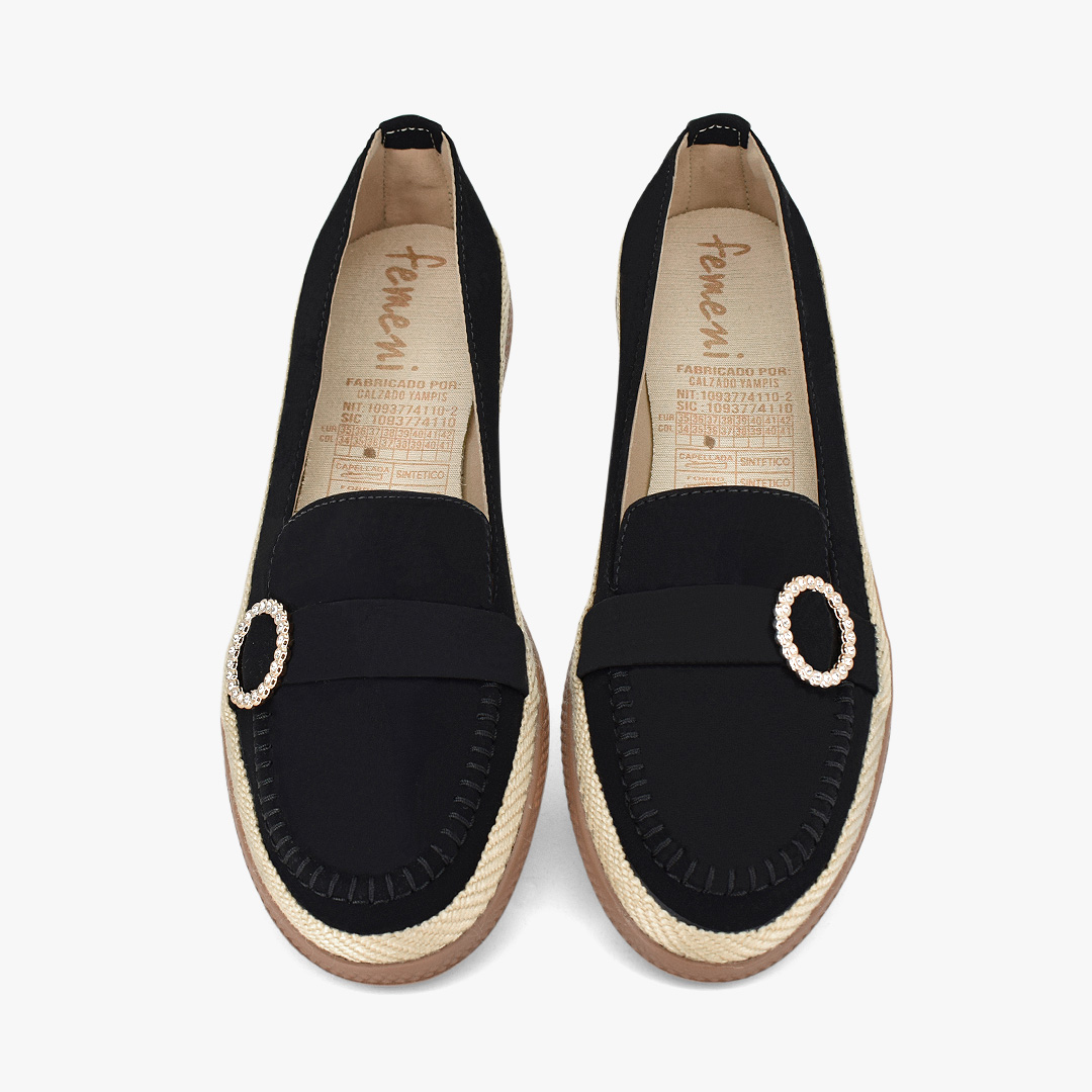 Estilo casual con un toque sofisticado que eleva cualquier look al instante. Acabado negro versátil, detalle de hebilla circular con brillo sutil y suela con efecto yute que aporta un aire fresco y moderno. Perfectos para combinar con jeans, vestidos o outfits de oficina y destacar con elegancia en cada paso.