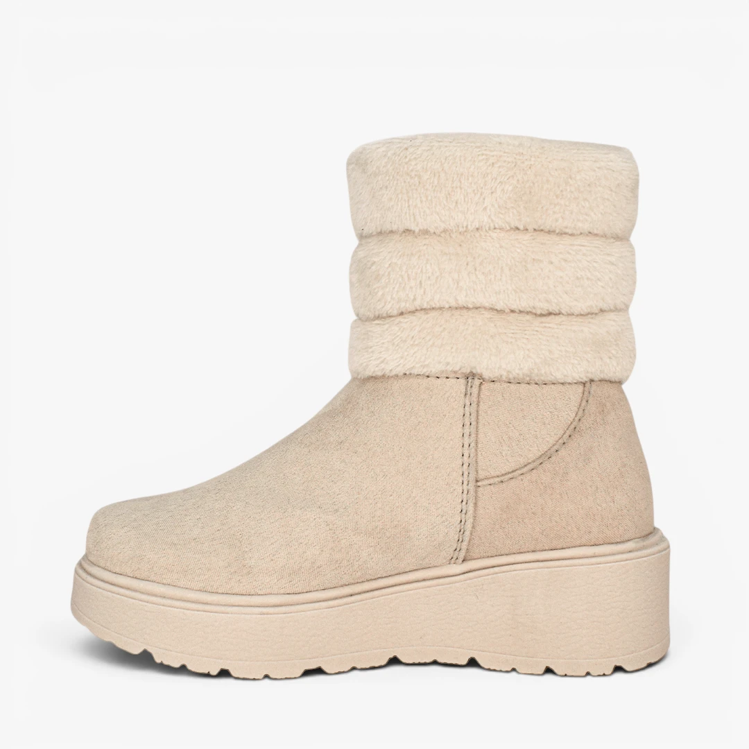 Una apuesta versátil que eleva cualquier look. El acabado tipo gamuza con cuello en textura suave aporta un contraste sutil, mientras la suela gruesa y la cremallera lateral completan un estilo moderno y en tendencia.