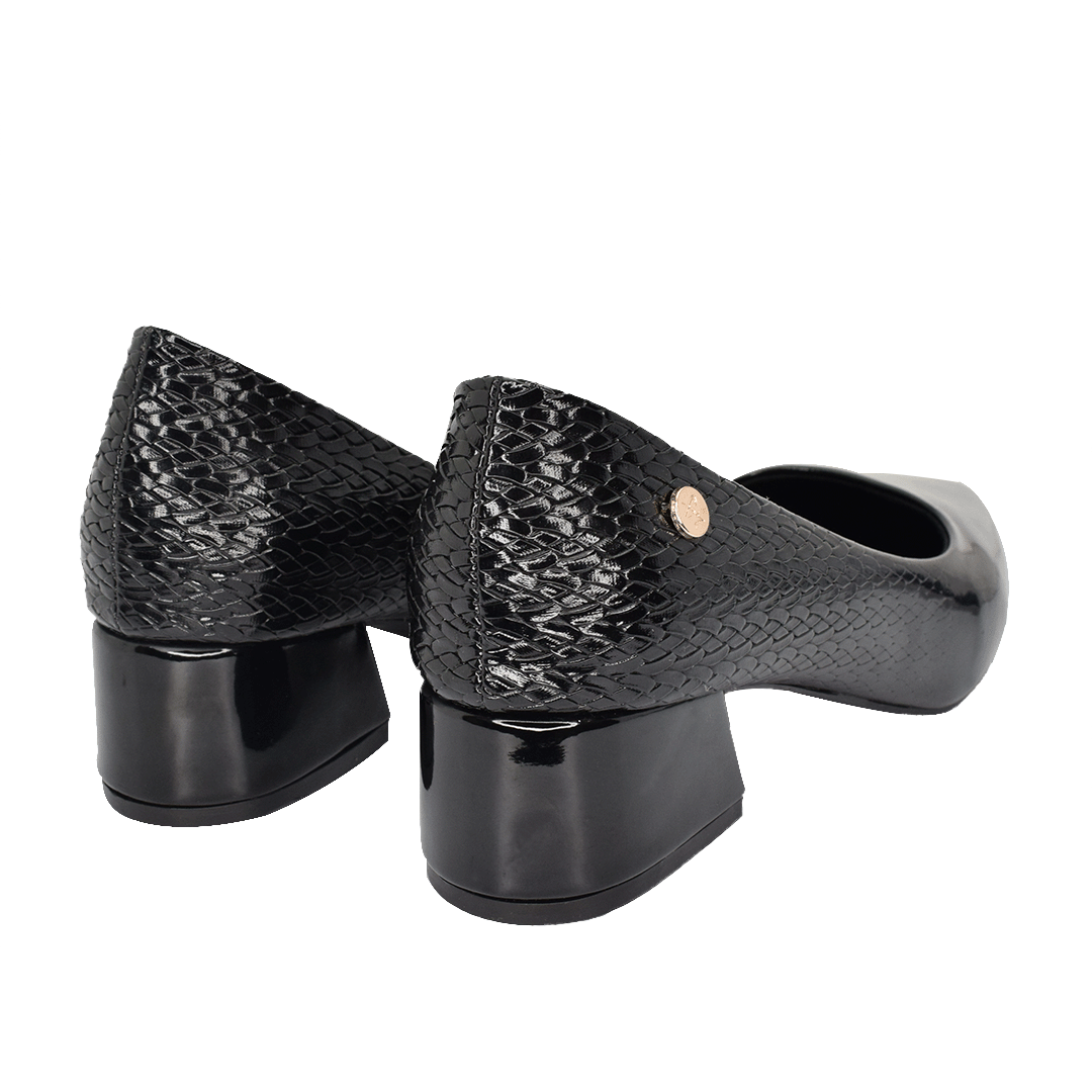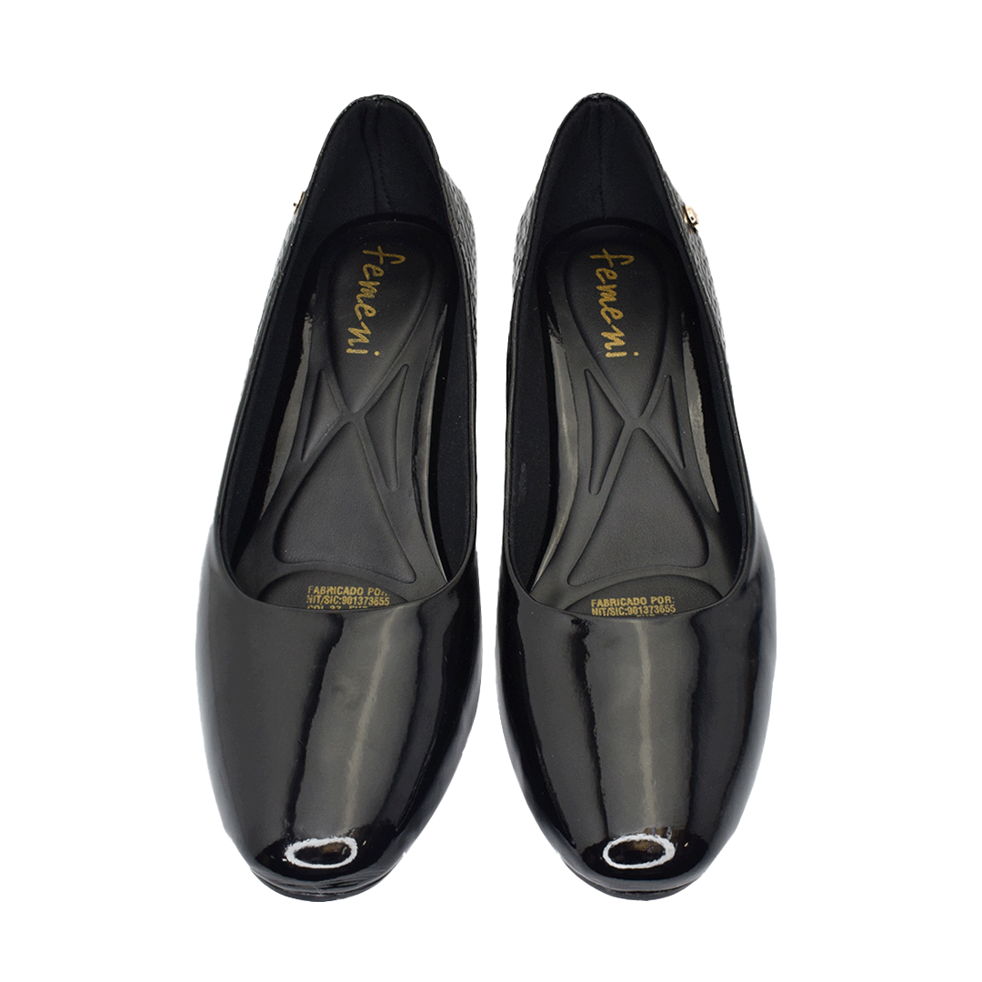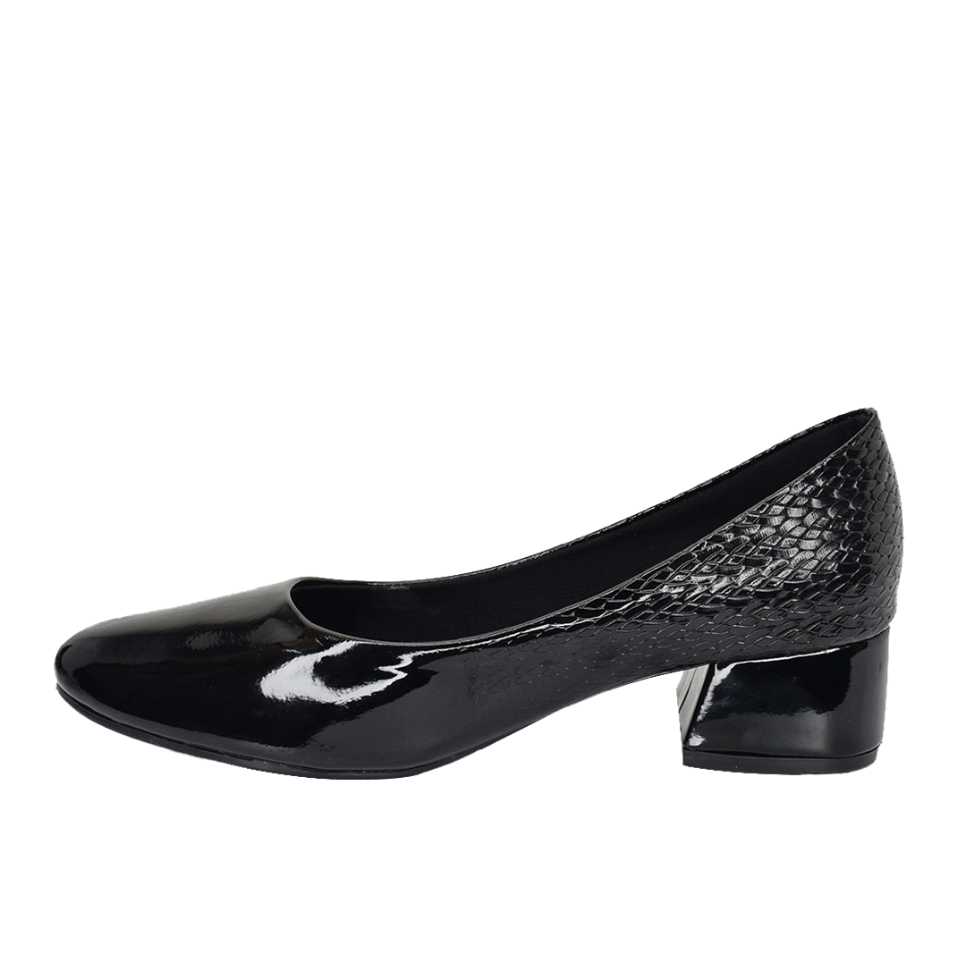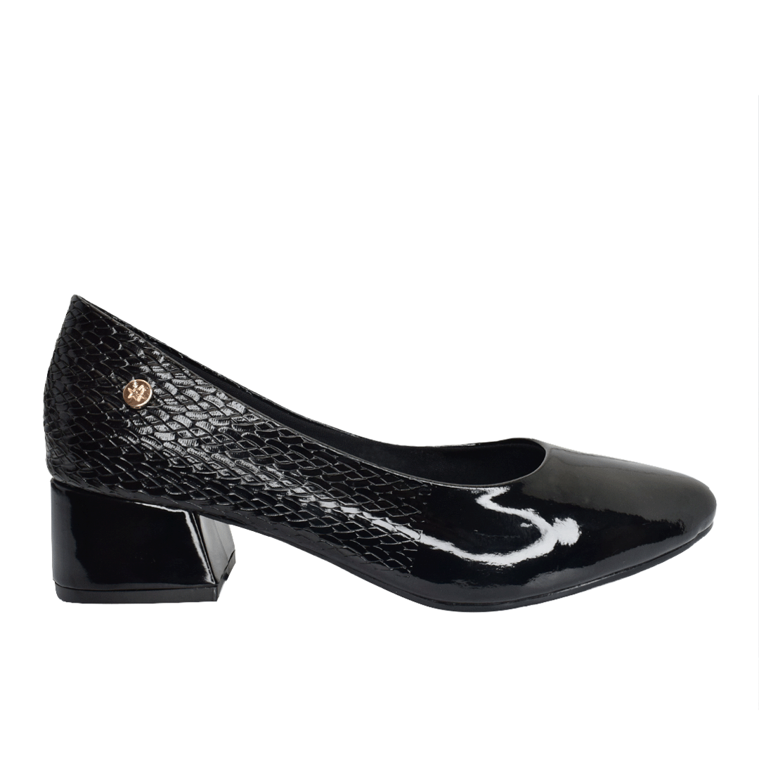 Sofisticación con estilo. Estos tacones de charol negro con punta redonda y diseño lateral destacan por su elegancia y versatilidad, con un tacón de 4 cm ideal para lucir cómoda y con clase.