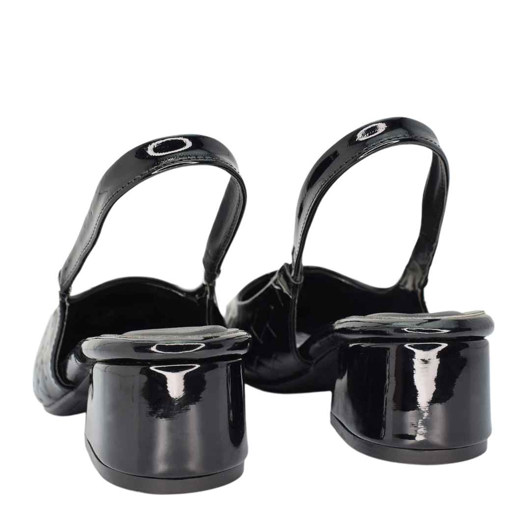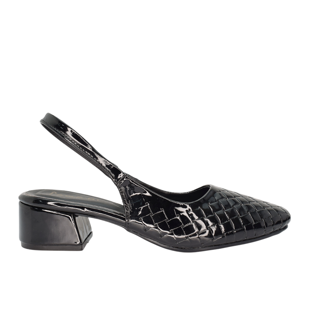 Sofisticación y comodidad en un solo diseño. Estos zuecos de tacón en charol negro cuentan con un elegante tacón cuadrado de 3 cm, ideal para un look casual con un toque refinado. Perfectos para destacar con estilo sin renunciar al confort.