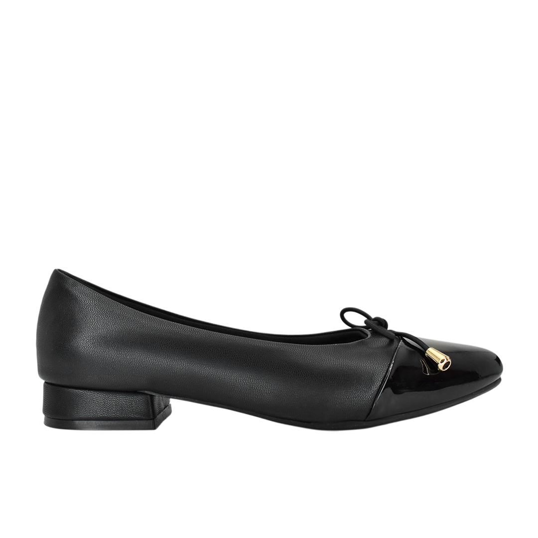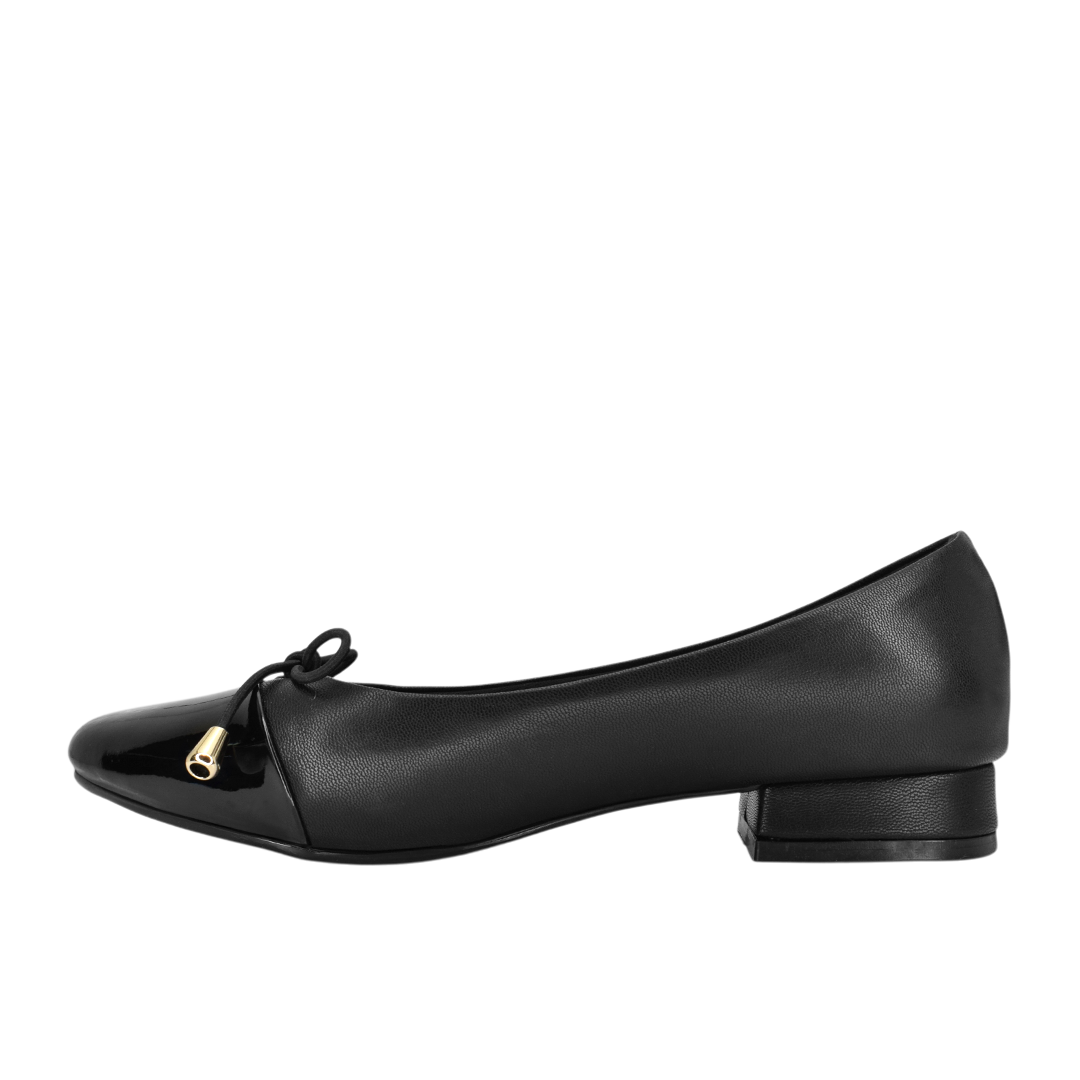 Sutiles y con mucho estilo. Estas baletas negras combinan elegancia y versatilidad con su punta tipo almendra en charol, un delicado moño y tacón bajo de 2 cm para acompañarte con comodidad todo el día