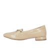 Mocasines de dama en charol beige crema, elegantes y sofisticados, realzados con un delicado herraje dorado que les da el toque perfecto de distinción.