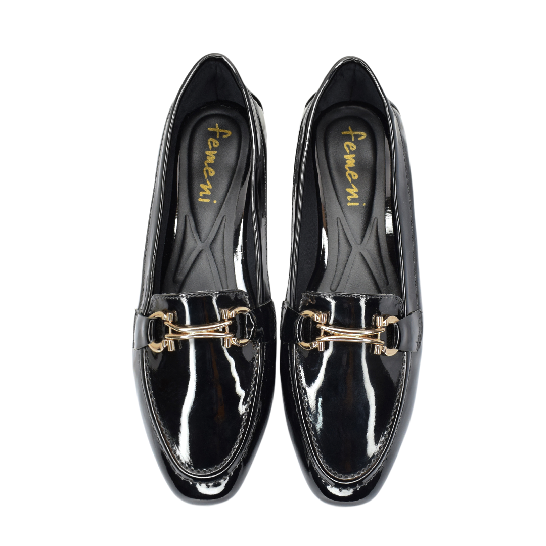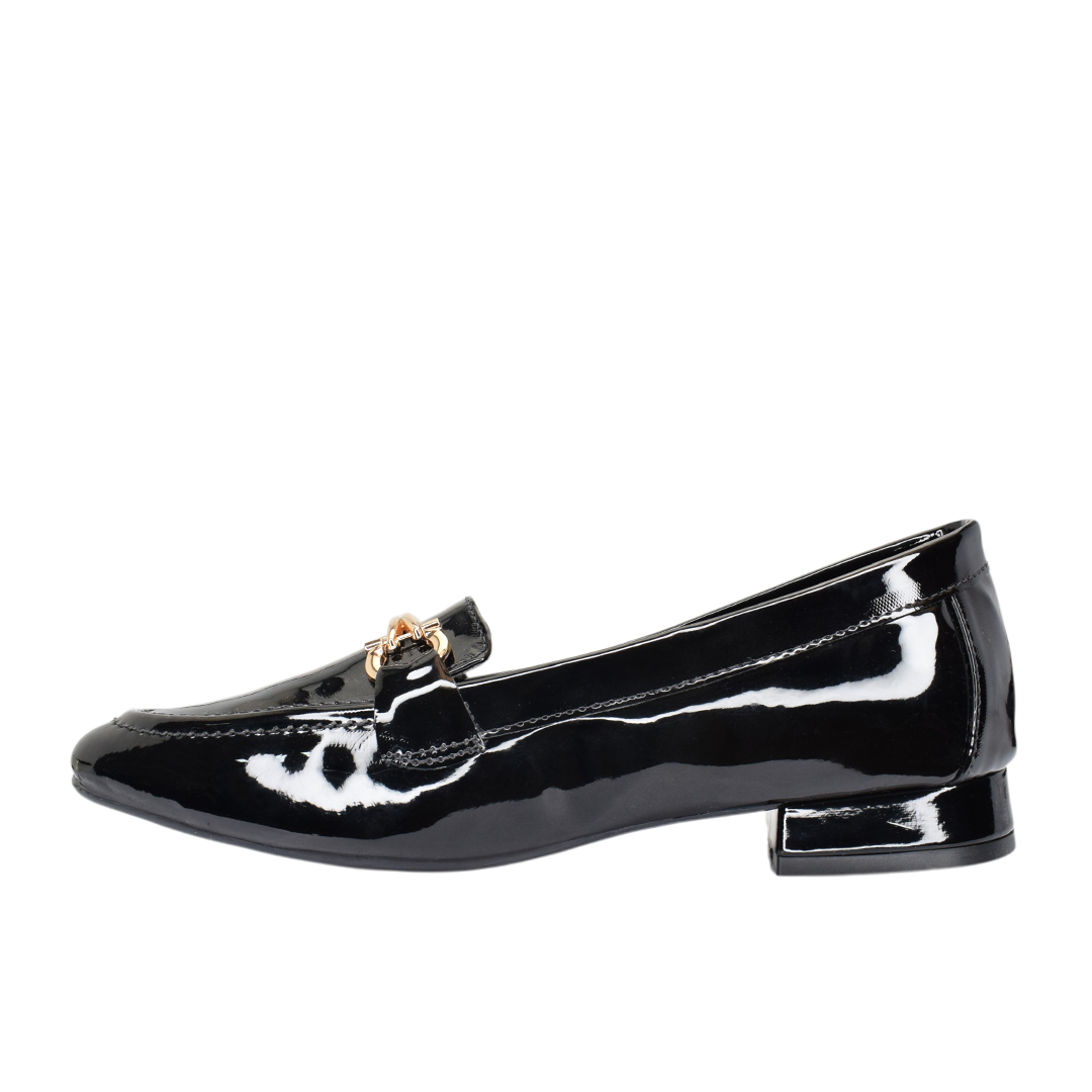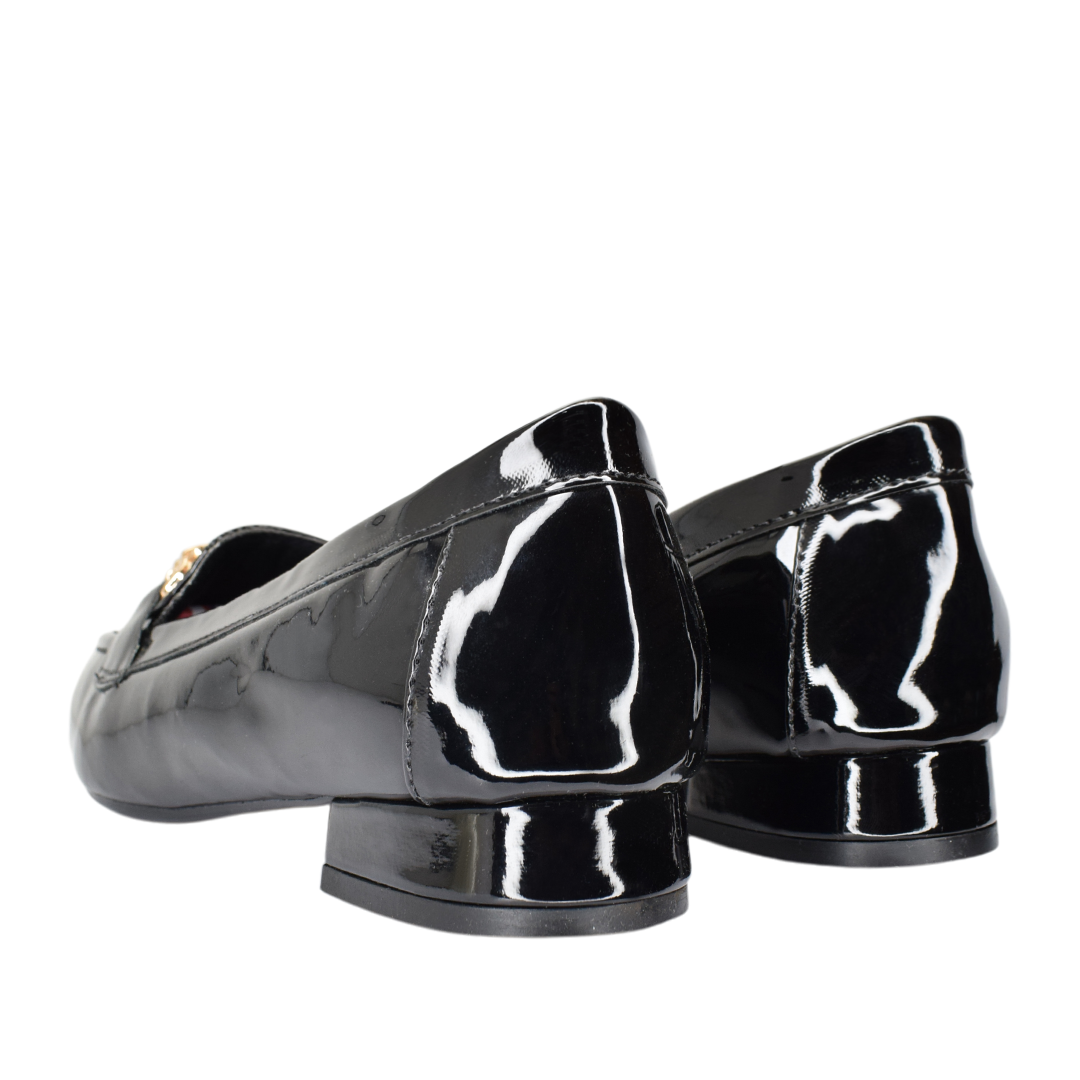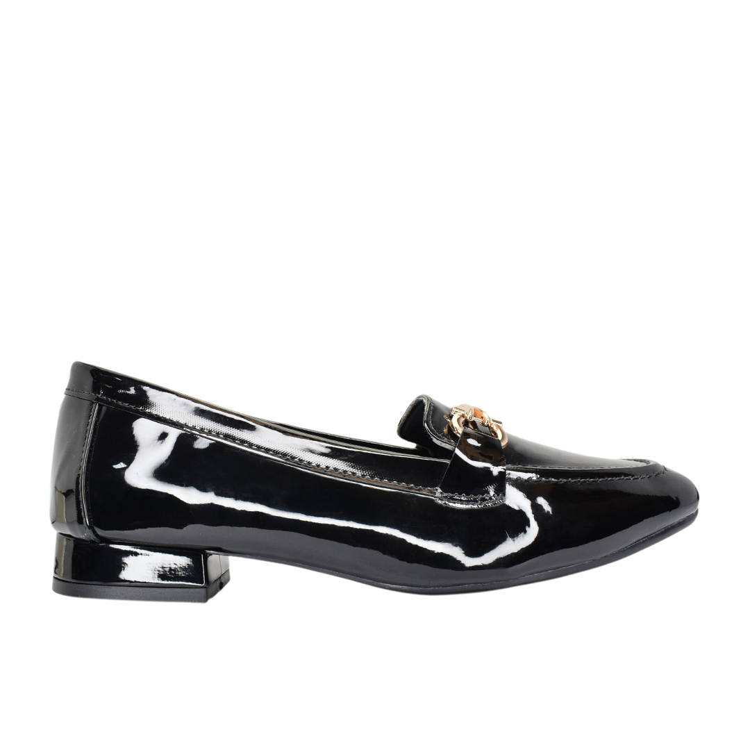 Mocasines de dama en charol negro, elegantes y sofisticados, realzados con un delicado herraje dorado que les da el toque perfecto de distinción.