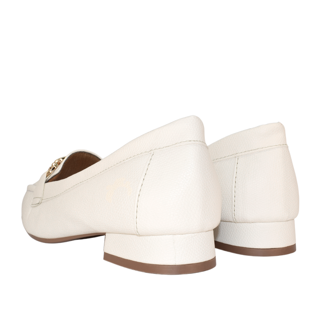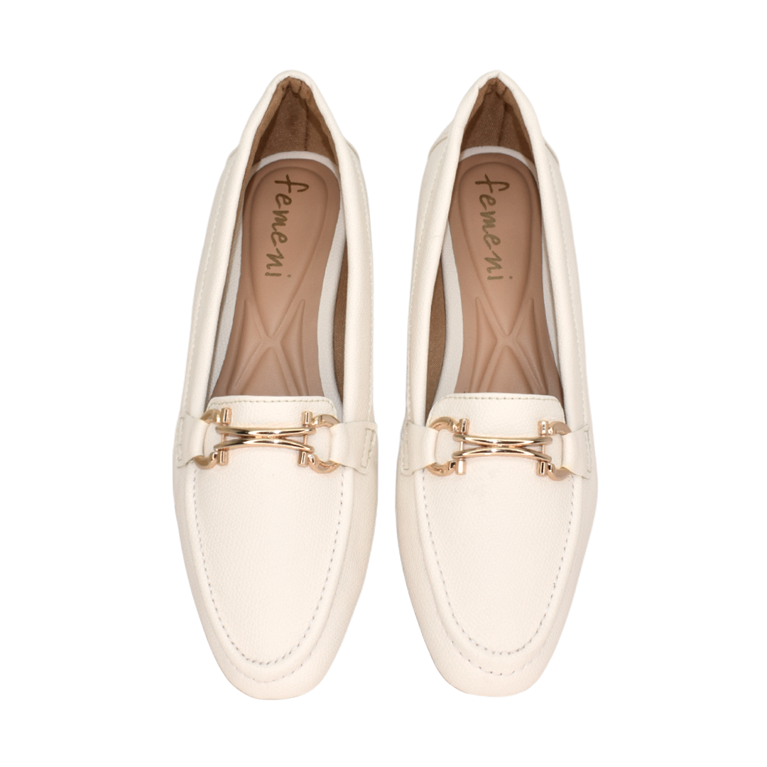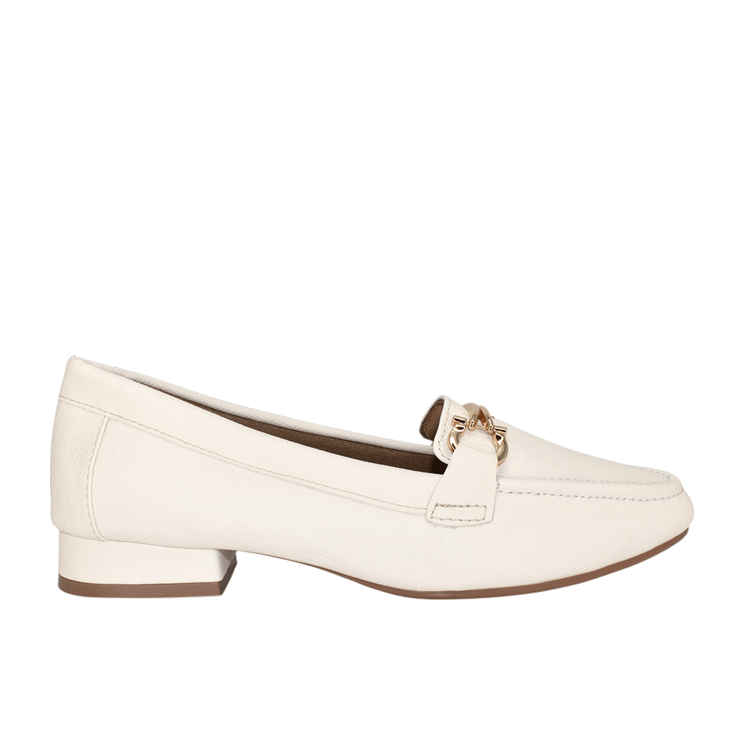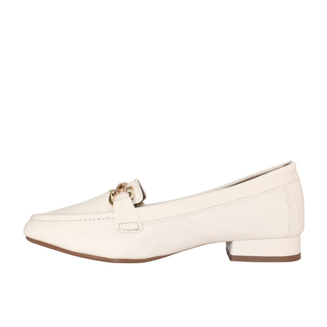 Con un diseño sencillo y elegante, estos mocasines en sintético mate color talco destacan por su lindo herraje decorativo, un estilo casual y versátil perfecto para cualquier ocasión.