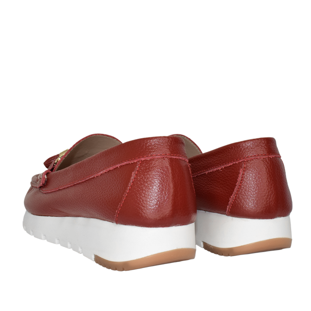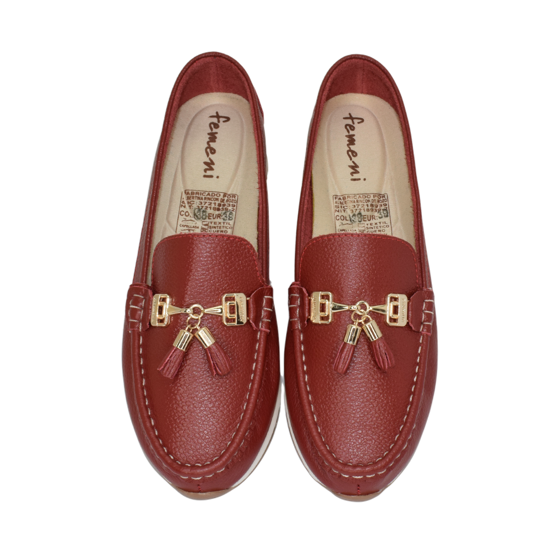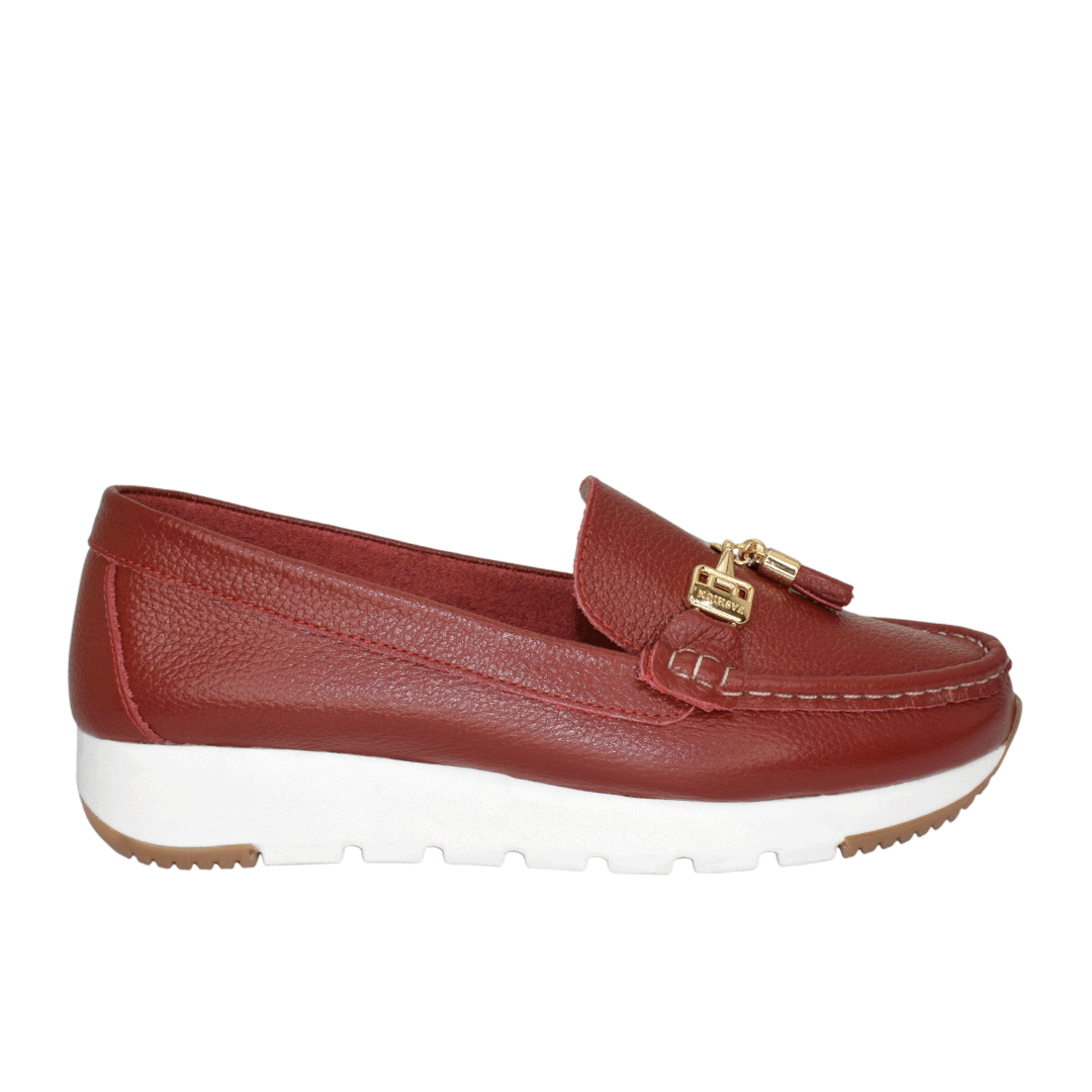 Un toque de glamour en cada paso. Estos mocasines de dama en cuero rojo, adornados con un elegante herraje dorado, destacan por su diseño sofisticado y atrevido que roba miradas.
