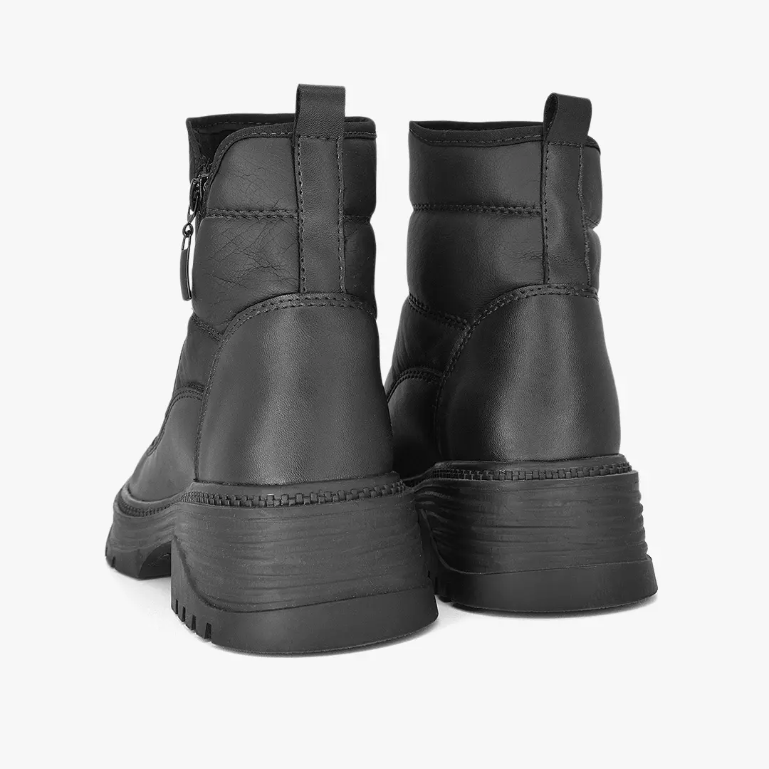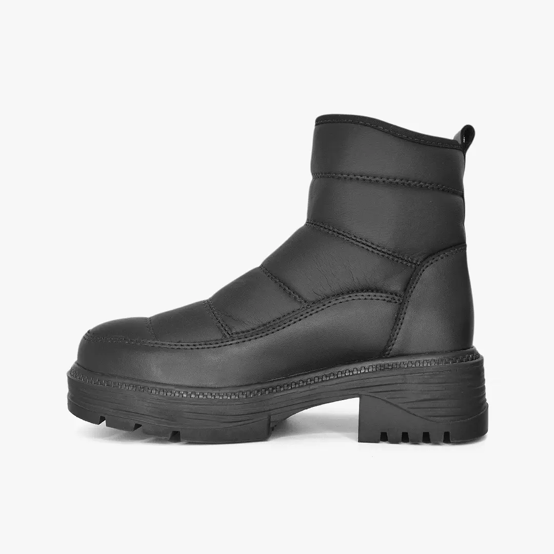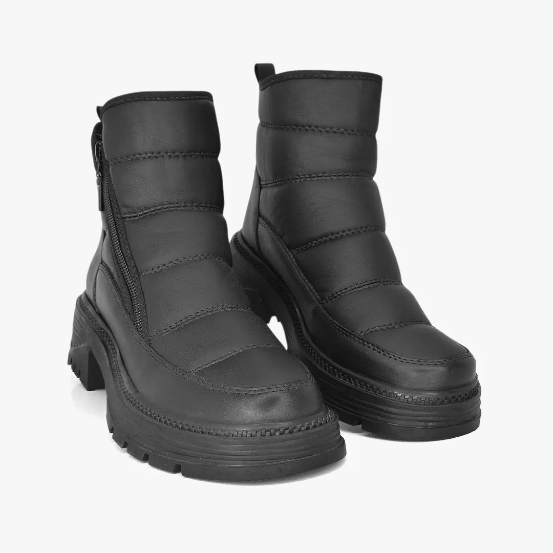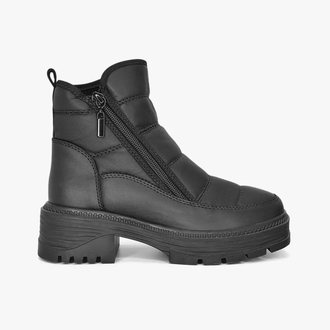 Actitud urbana que destaca con su acabado acolchado y líneas modernas. La cremallera lateral y su suela robusta crean un look con carácter, ideal para elevar cualquier outfit con personalidad.