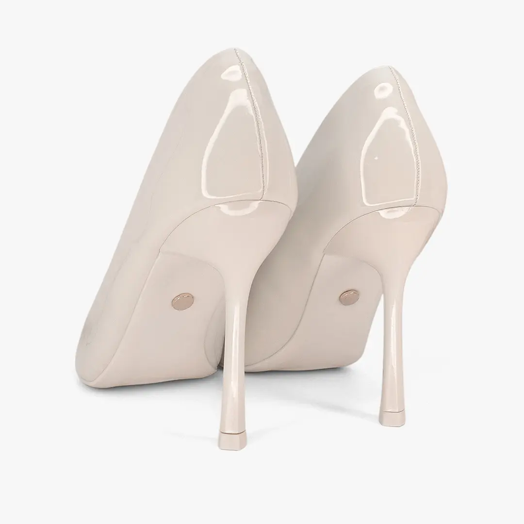 Sutileza que eleva cualquier look. Silueta de punta fina con acabado brillante en tono talco y tacón estilizado, ideal para aportar un toque delicado y sofisticado en cada ocasión.