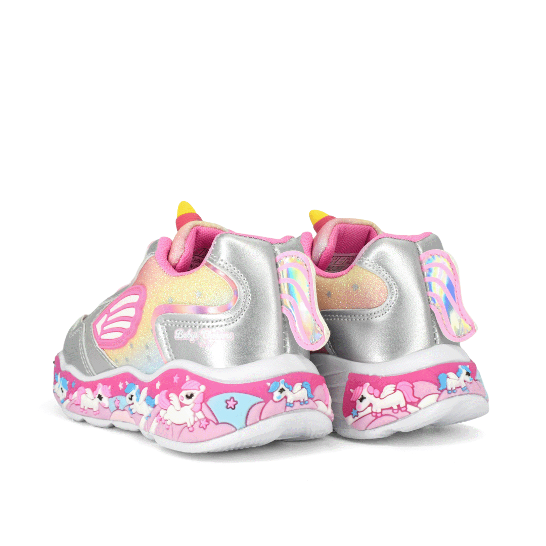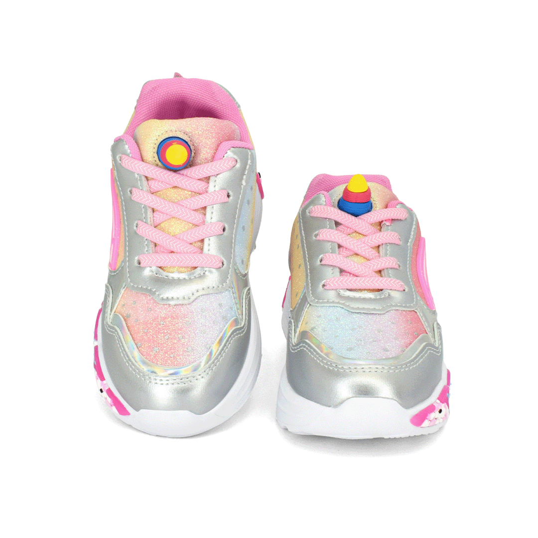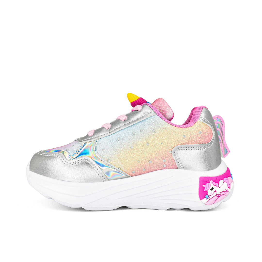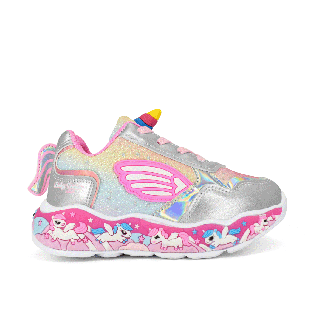 Acabados metalizados con efecto tornasol, detalles encantadores de unicornios y alas en relieve que llenan de magia cada paso. Incorporan suela con luces que prenden al caminar, creando un efecto llamativo y divertido. Perfectos para niñas que aman destacar y llevar un toque de cuento a todas partes.