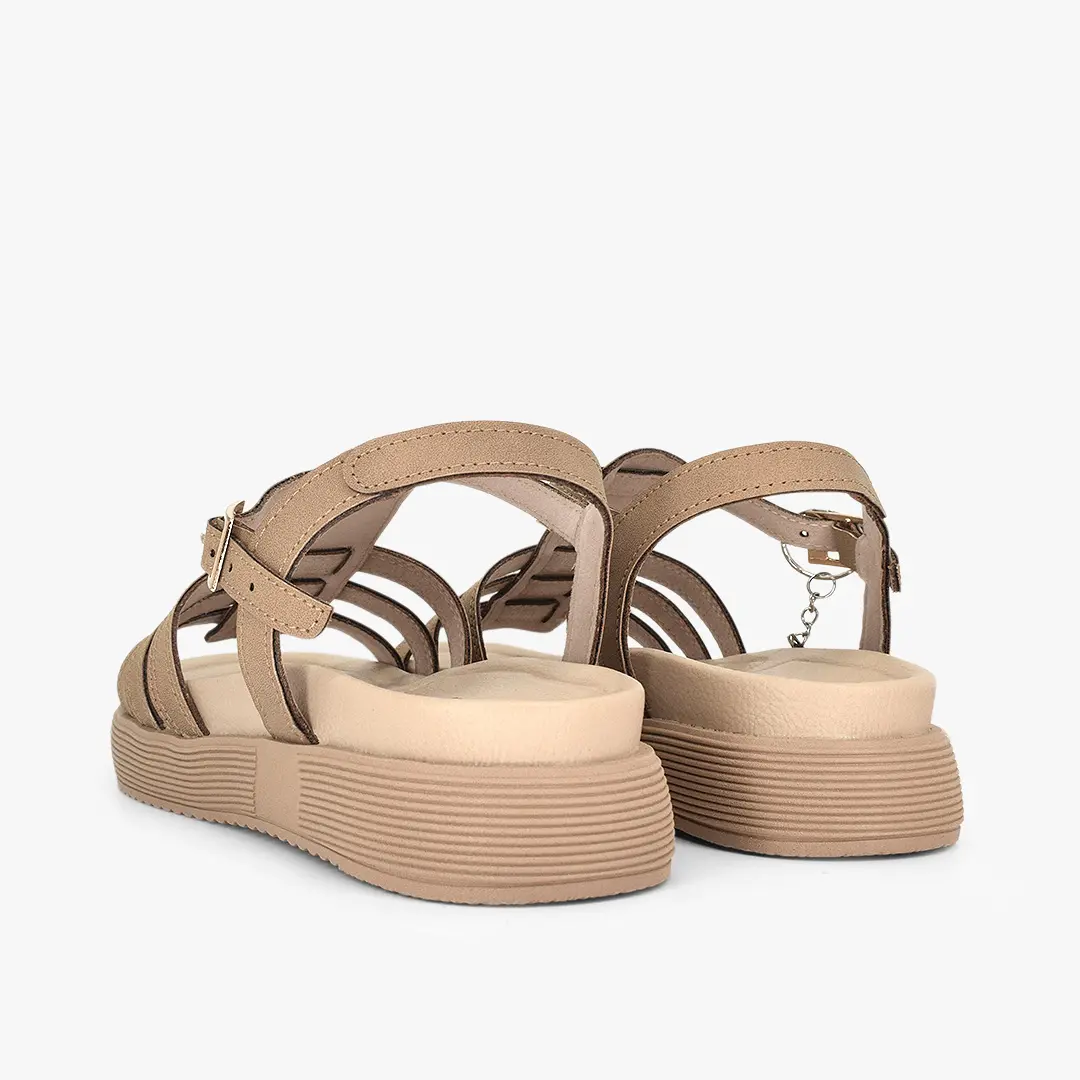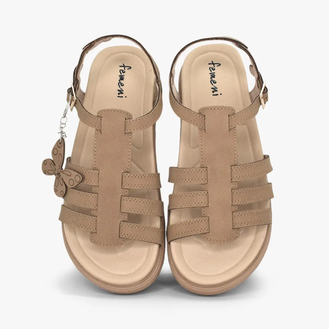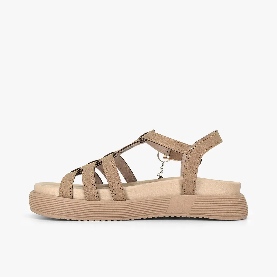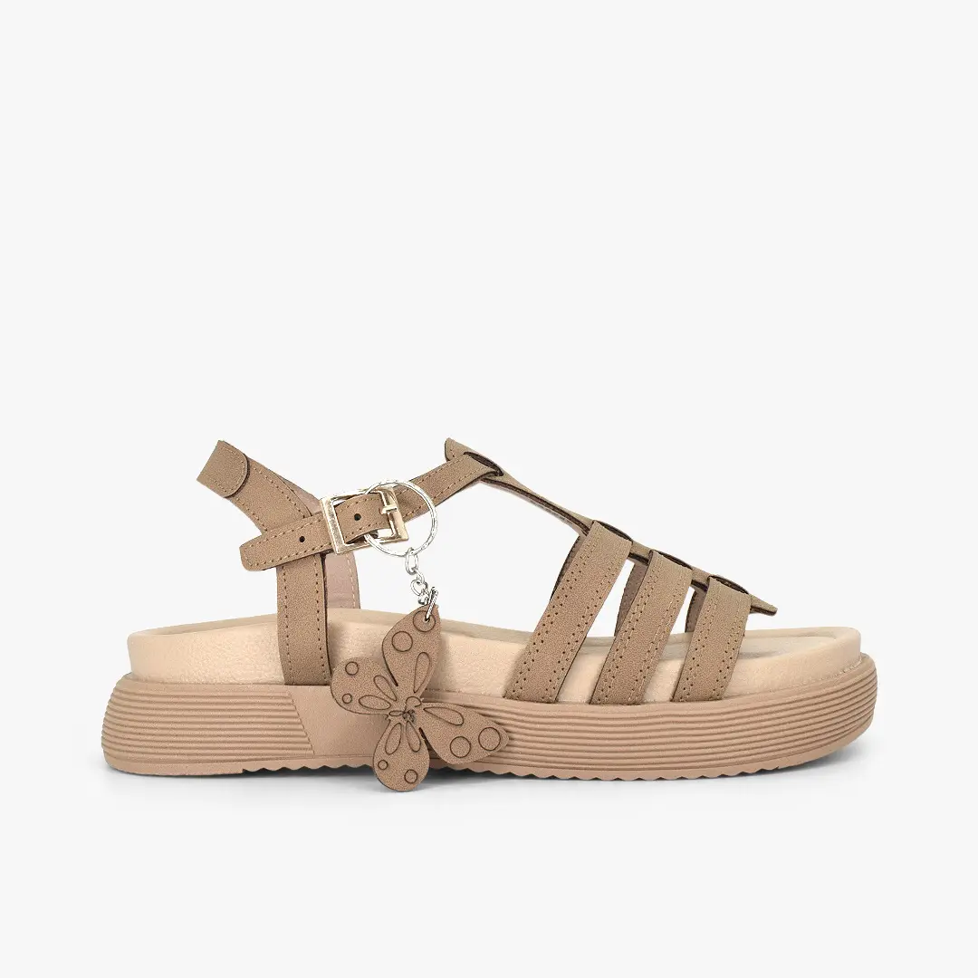 Estilo cangrejera en tono almendra que resalta por su look fresco y versátil. Las tiras aportan un ajuste seguro, mientras el detalle de mariposa añade un toque femenino y encantador que eleva cualquier outfit casual.
